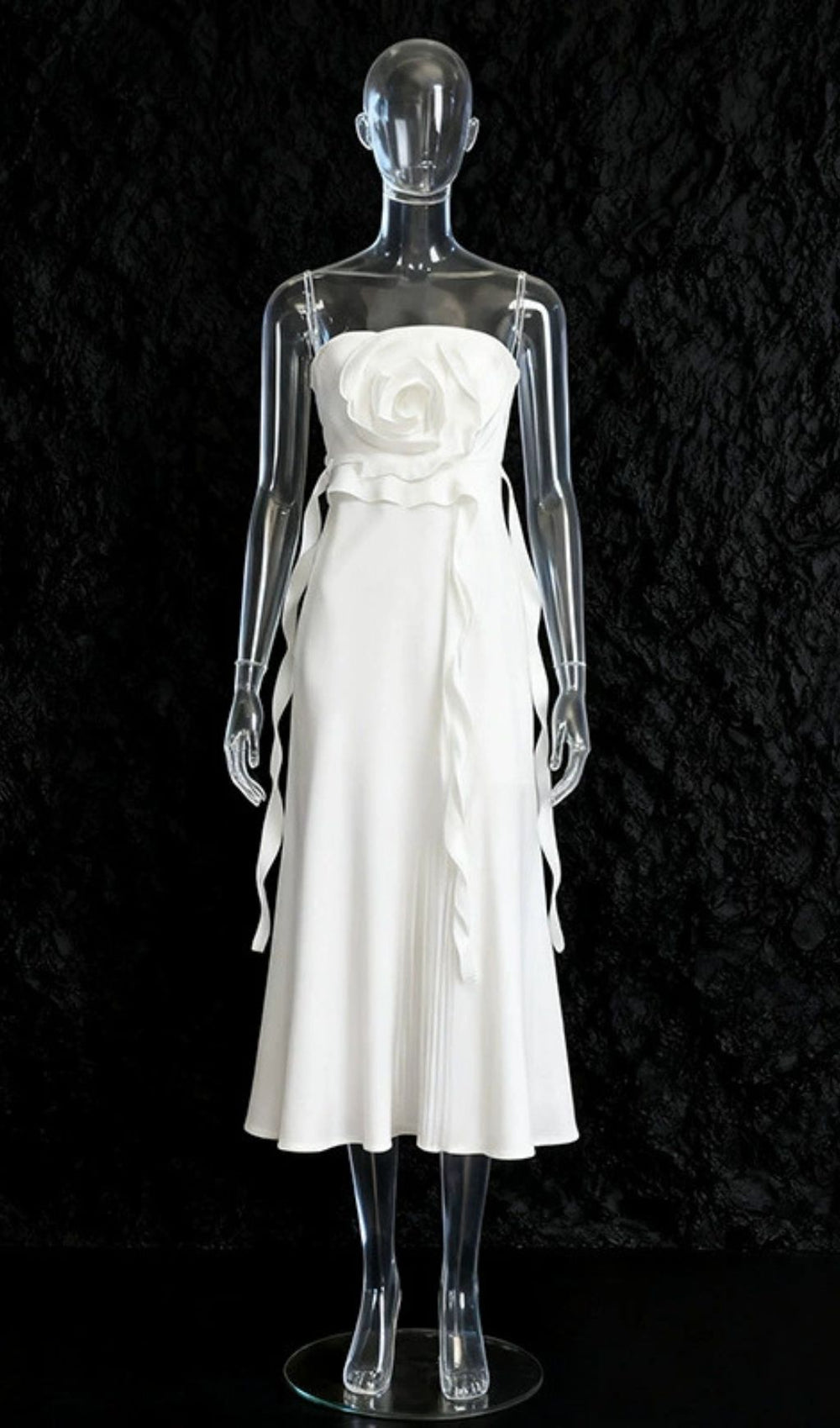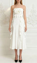 Crafted to flatter. the strapless neckline beautifully showcases your colletage. while delicate. cascading ruffles gently flow down the sides. adding a touch of whimsical movement. The graceful midi length provides a timeless silhouette. perfect for gliding through any event with confidence and style.