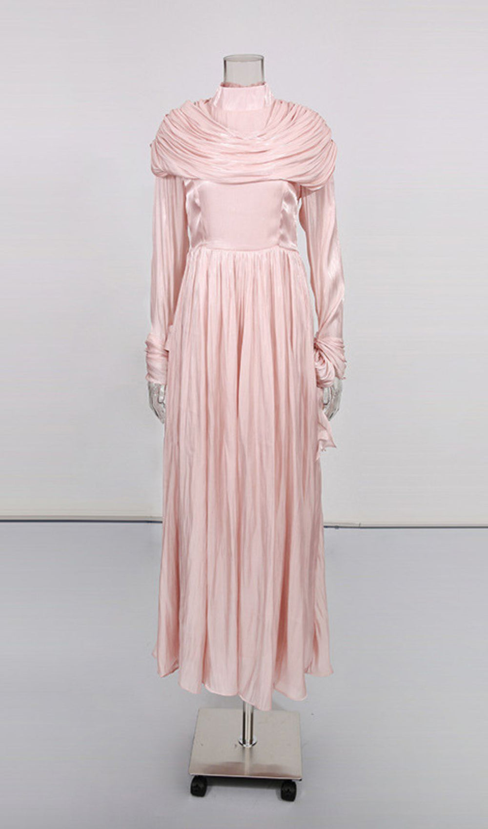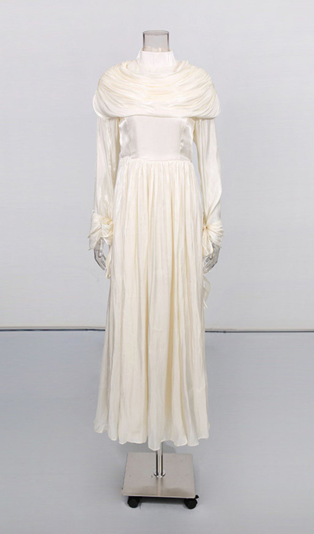 The Iyla Dress features a truly unique sculptural draped and ruched high neckline that creates an ethereal. soft framing around your colletage and shoulders. This artistic detail flows seamlessly into elegant long sleeves. culminating in delicate ruffled cuffs that add a touch of romantic charm. The fitted bodice gently defines your silhouette. leading to a magnificent. flowing pleated maxi skirt that promises graceful movement and an endlessly flattering drape.