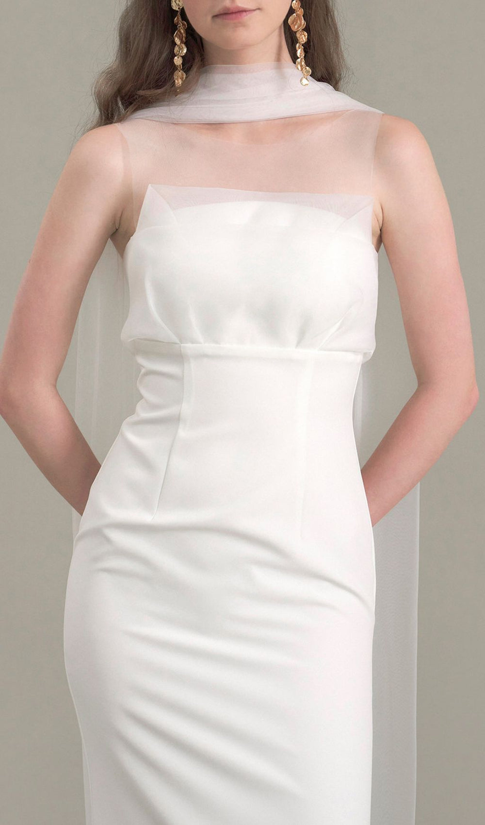 Crafted from a premium white fabric with a beautiful subtle sheen. the Jalene dress offers a truly opulent touch without compromising on elegant simplicity. The meticulously sculpted sweetheart neckline provides a romantic and flattering frame for your colletage. while the structured bodice cinches gently to enhance your natural curves. The dress gracefully flows into a sleek. floor-length column silhouette. celebrating your figure with understated allure. This gown is a testament to minimalist beauty. perfect for the bride who desires a refined and impactful statement.