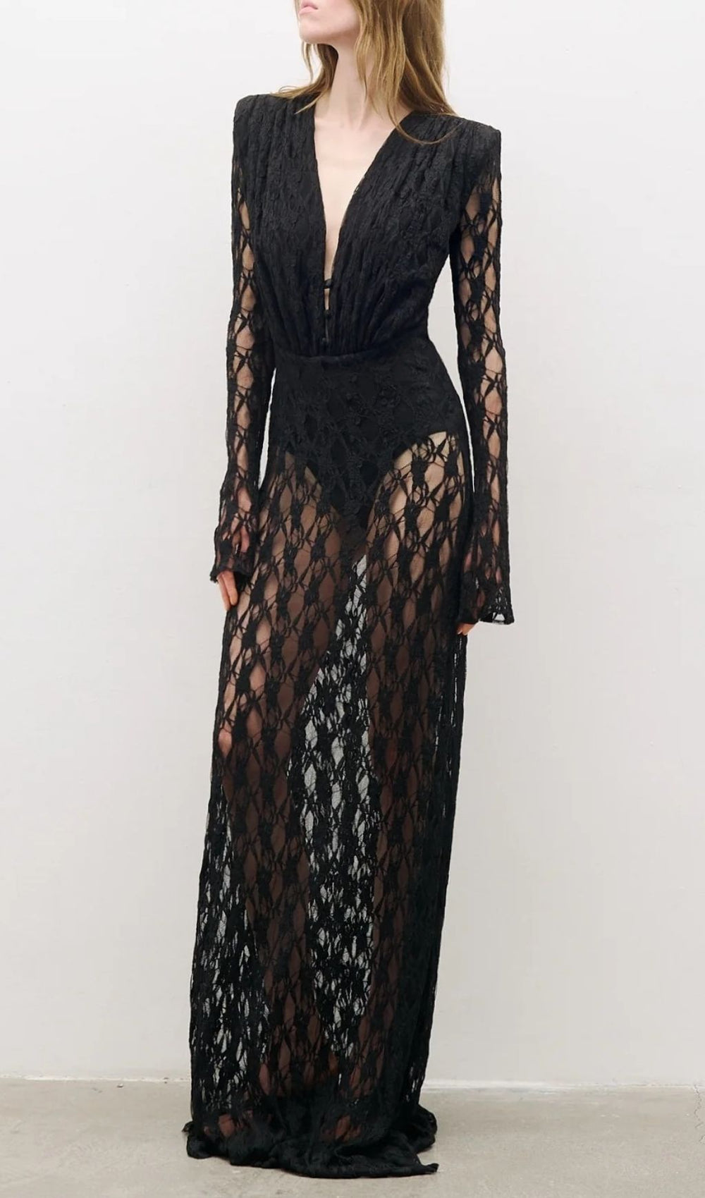 Featuring a dramatic deep V-neckline and elegant long sleeves that subtly flare. the Jemma dress exudes confidence. The floor-length design cascades beautifully. enhancing your figure while the sheer construction offers a tantalizing glimpse of skin. or allows for personalized styling with a sleek slip or bodysuit underneath for varied levels of coverage. Whether you're aiming for a subtly seductive look or a bold red-carpet moment. this dress is your ultimate canvas for high-fashion expression.