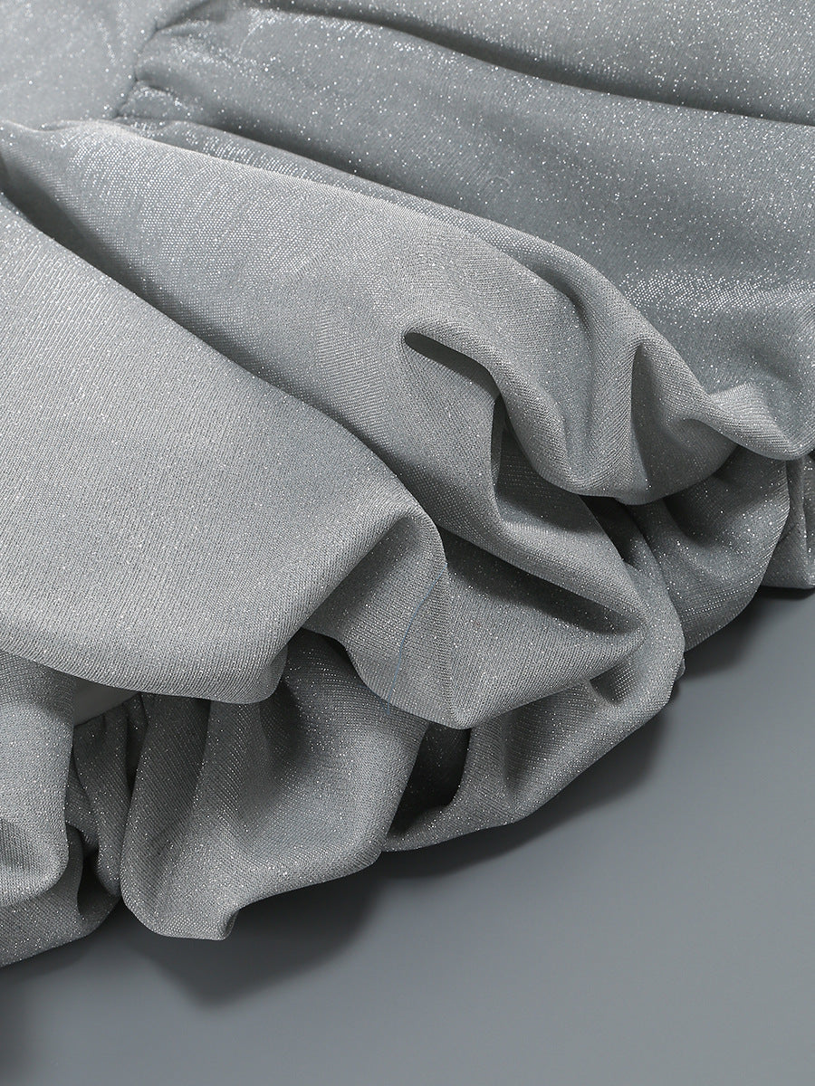Crafted from a fabric that shimmers with every move. this dress boasts a captivating silvery-grey hue infused with dazzling sparkle. perfectly catching the light from every angle. The sophisticated structured halter neckline elegantly frames your colletage. leading to a chic square bust line and a beautifully fitted. corset-inspired bodice that celebrates your figure.