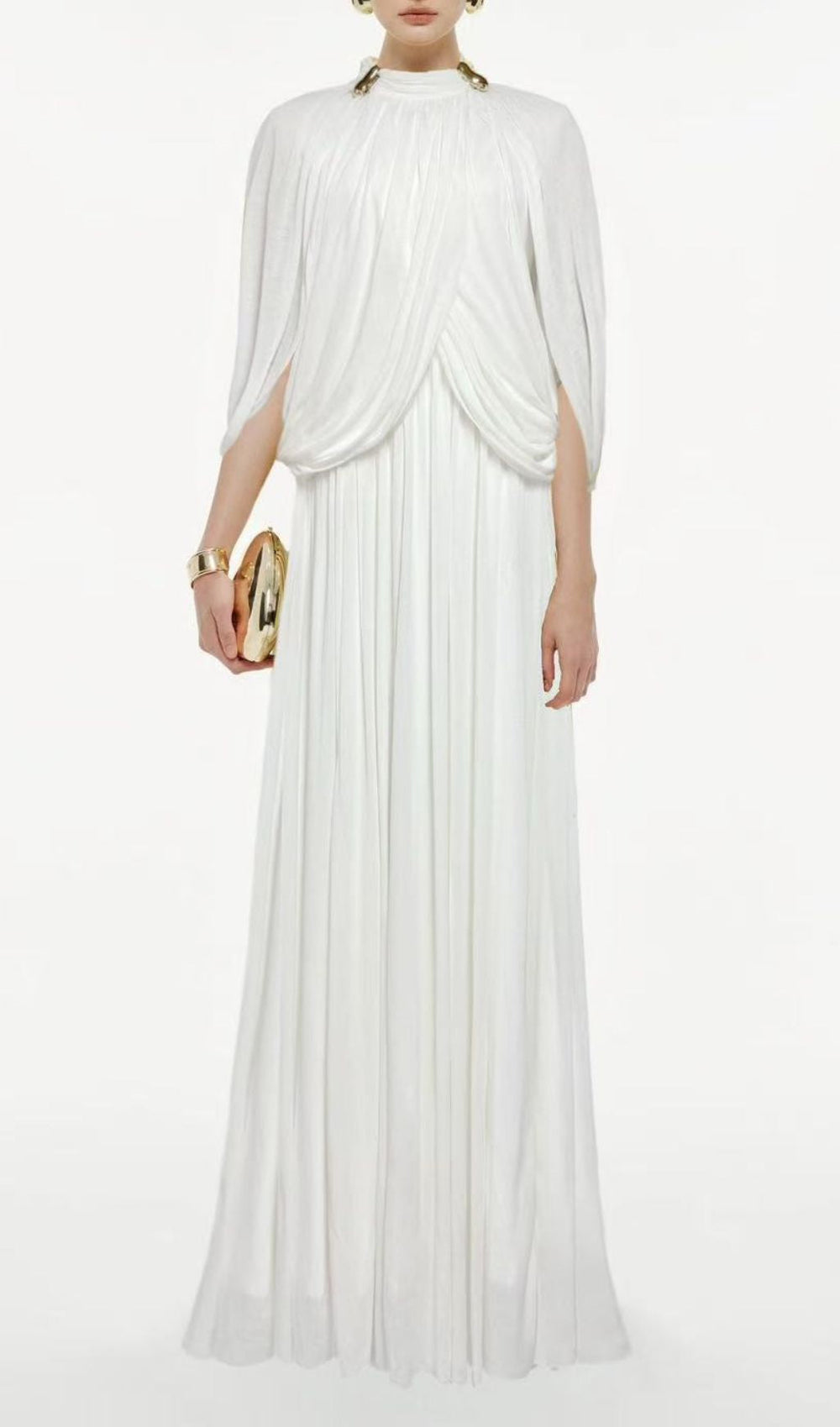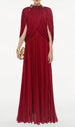 The Jodell dress is defined by its luxurious. finely detailed pleats that cascade dramatically. creating a breathtaking waterfall of texture and fluid movement from its captivating bodice to the graceful maxi hem. The unique design features a chic high neckline adorned with elegant hardware. beautifully complemented by an integrated cape-like drape that offers sophisticated arm coverage and an ethereal silhouette.