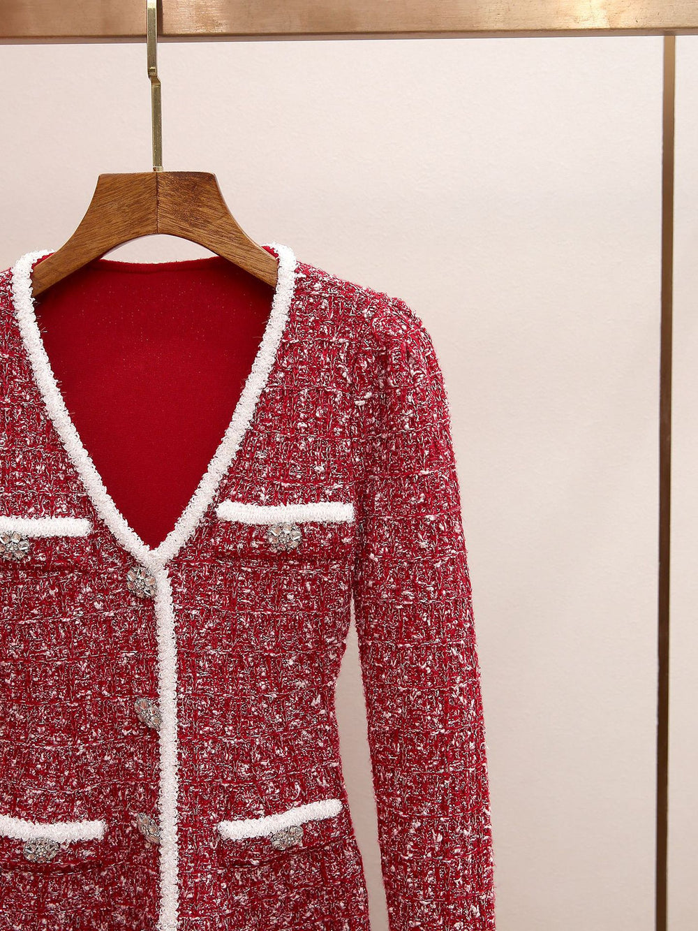 Make an unforgettable impression with the exquisite Jones Scarlet Tweed Mini Dress. Designed for the modern American woman who commands attention. this mini dress is a true fusion of classic elegance and contemporary sparkle. Its vibrant scarlet hue. woven into a luxurious tweed fabric. ensures you'll stand out in every crowd.