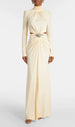 Crafted from a luxurious. flowing fabric. the Jovita dress features a chic high neck and graceful long sleeves. Its bodice is expertly ruched. leading to a captivating waist cutout adorned with a stunning. sparkling jewel-like embellishment. This dazzling detail cinches the silhouette. creating a remarkably flattering shape that flows into a beautifully draped. floor-length skirt with a subtle front slit for effortless movement.