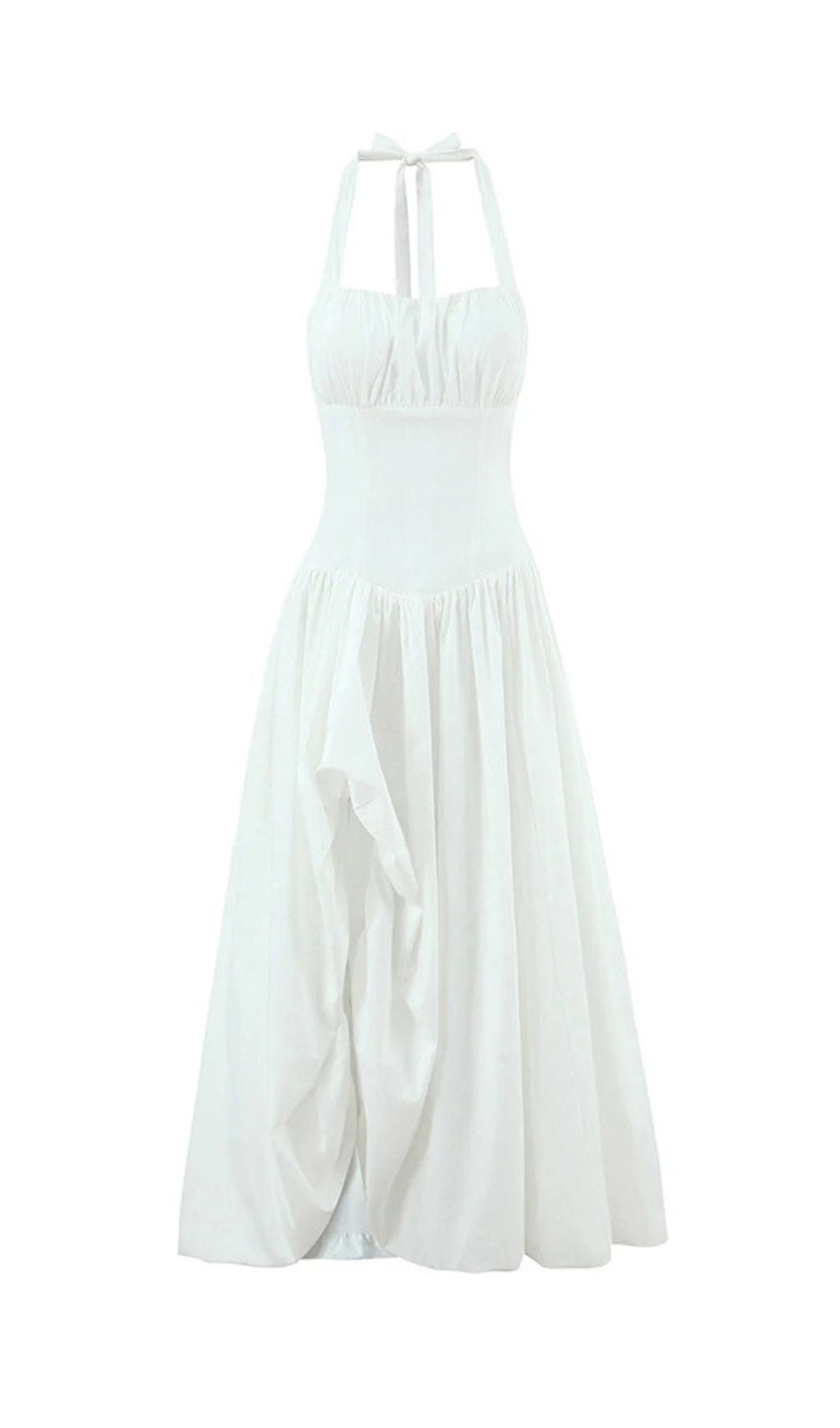 The Judas Dress features a flattering halter neckline that beautifully accentuates the shoulders and colletage. Its expertly tailored bodice flows into a dramatically voluminous maxi skirt. creating a powerful. architectural silhouette. Crafted from a luxurious. fluid fabric with a subtle matte sheen. the skirt cascades with effortless movement. culminating in an alluring high-leg slit that reveals just the right amount of sophistication.