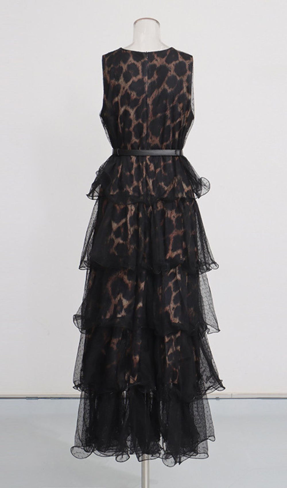 Crafted with an eye for detail. the Kaelyn dress features a stunning sleeveless design and an elegant studded round neckline. adding a touch of edgy sparkle. The multi-tiered ruffled maxi skirt. fashioned from delicate polka-dot mesh. dances with every movement. revealing subtle glimpses of the bold leopard print beneath. Cinch your waist with the included sleek black belt. complete with a chic gold-tone buckle. to create a flattering. hourglass silhouette that's sure to turn heads.