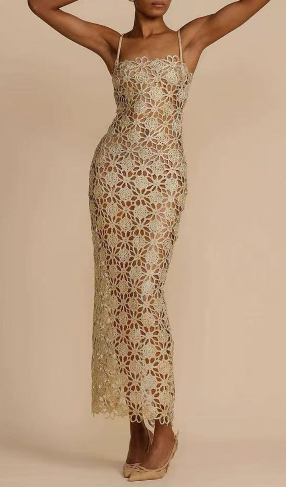 Step into the spotlight and command attention with the exquisite Kakalina Golden Crochet Maxi Dress. This show-stopping gown is a masterpiece of modern allure. designed for the woman who desires to make an unforgettable entrance. Its intricate. open-work crochet pattern. reminiscent of delicate golden lace. creates a mesmerizing dance between fabric and skin. revealing just enough to intrigue.