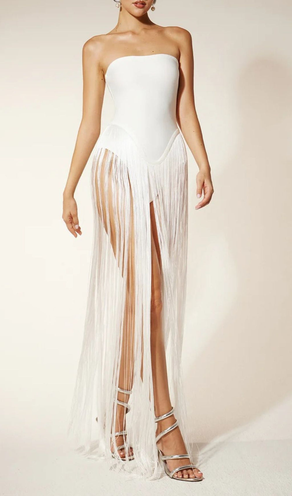 Prepare to command every room and leave an unforgettable impression in the Rendor White Strapless Fringe Bandage Maxi Dress. Designed for the woman who owns her confidence. this breathtaking gown combines timeless elegance with a modern. dynamic edge. making it your ultimate choice for any grand occasion.